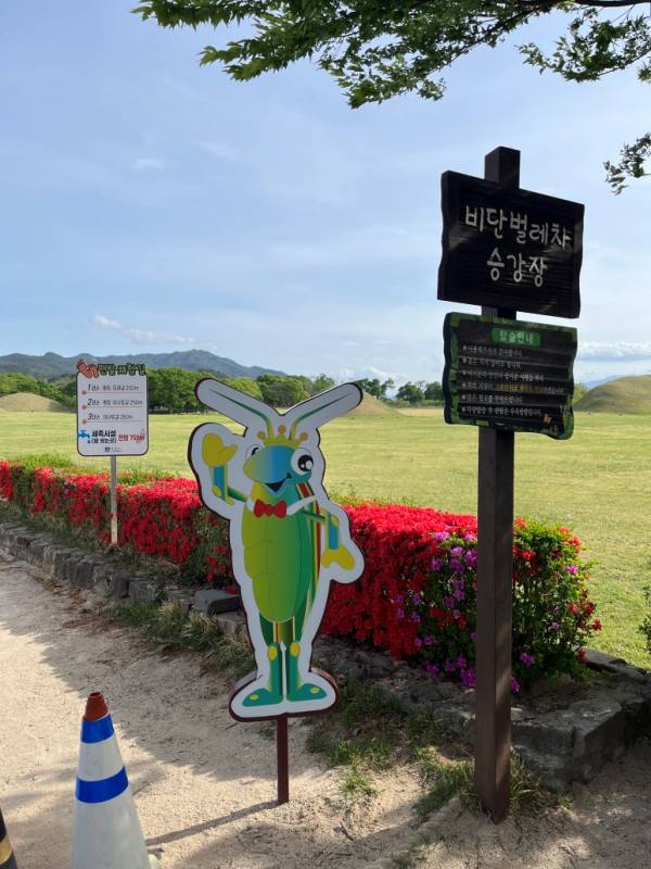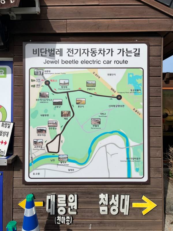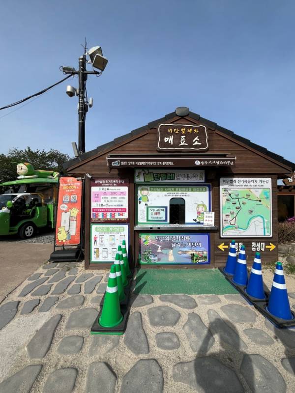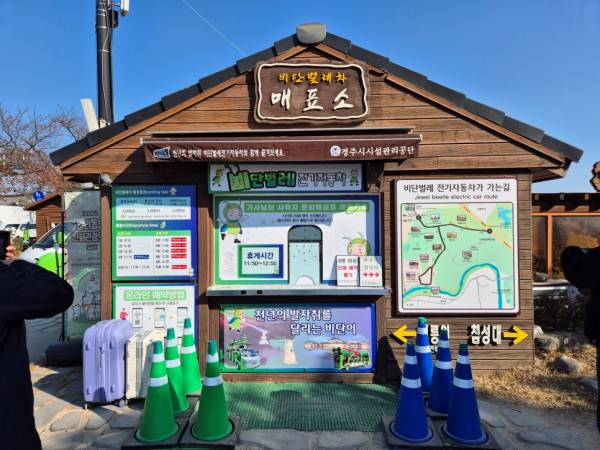 경주 비단벌레차 매표소는 첨성대와 대릉원 사이에 위치하고 있어 찾기 쉽습니다. 근처에 대릉원 공영주차장이나 천마총 노상주차장이 있어 주차 후 황리단길을 산책하며 이동해도 좋습니다. 포토존도 있어 사진 찍기 좋고, 운행을 기다리며 신라 문화 관련 안내문도 읽을 수 있습니다.