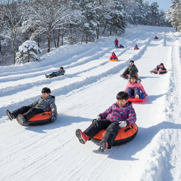 눈꽃마을 눈썰매장에는 1인용 코스와 2인 이상 동반 가능한 코스로 나뉘어 있어 연령대와 체험자 수에 따라 선택할 수 있습니다.