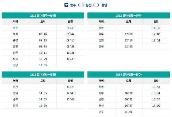 시간표는 계절과 요일에 따라 변동될 수 있습니다. 예를 들어, 화요일과 수요일은 운휴일인 경우가 많고, 하루 2회 정도 운행되니 정확한 시간표는 코레일 공지사항에서 확인하는 것이 안전합니다. 보통 오전에는 영주에서 출발해 철암으로, 오후에는 철암에서 영주로 되돌아오는 구조입니다.